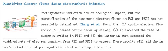 在开发出研究方法和技术的基础上,该研究团队2019年进一步合作研究了植物光诱导期间光合电子在两个光系统间的传递和分配过程。自然条件下,植物获得光能的环境是非常复杂的,由于太阳高度角和云层的不断变化,或植物群体内的叶片在风、机械、动物或人工干扰下,植物总是处于变动光照条件下,形成了波动光(fluctuating light)环境。因此,植物的光合作用总是处于非稳定状态的光照环境,而且40%~60%光合碳素是在波动光下获取的。长期以来,人们一直利用稳态的光环境下测定的光合作用来评估植物的碳素积累,并且利用稳态条件下获得的碳素资料评价生态碳汇过程,这就会出现较大偏差。波动光是由黑暗或弱光到强光下光合速率逐渐增大,或者由强光转为黑暗或弱光的过程,光合作用就形成了光合诱导或光诱导(photosynthetic induction)过程。