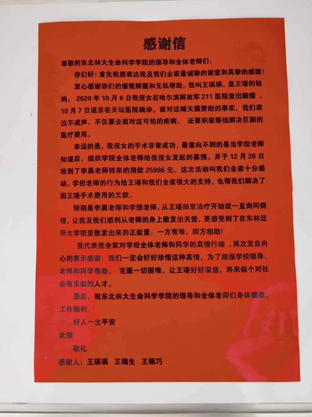 在东北林业大学生命科学学院5楼的走廊里,一张红色的“感谢信”赫然醒目,信中字里行间满满都是王璠的姑妈代表他们全家给学院领导和老师的敬意和谢意,“我们全家深深感受到了学院老师们散发出的关爱,更感受到了东林这所学校里散发出来的正能量,我们将铭记这份真情,让王璠用实际行动来回馈学院、回馈学校、回馈社会。”