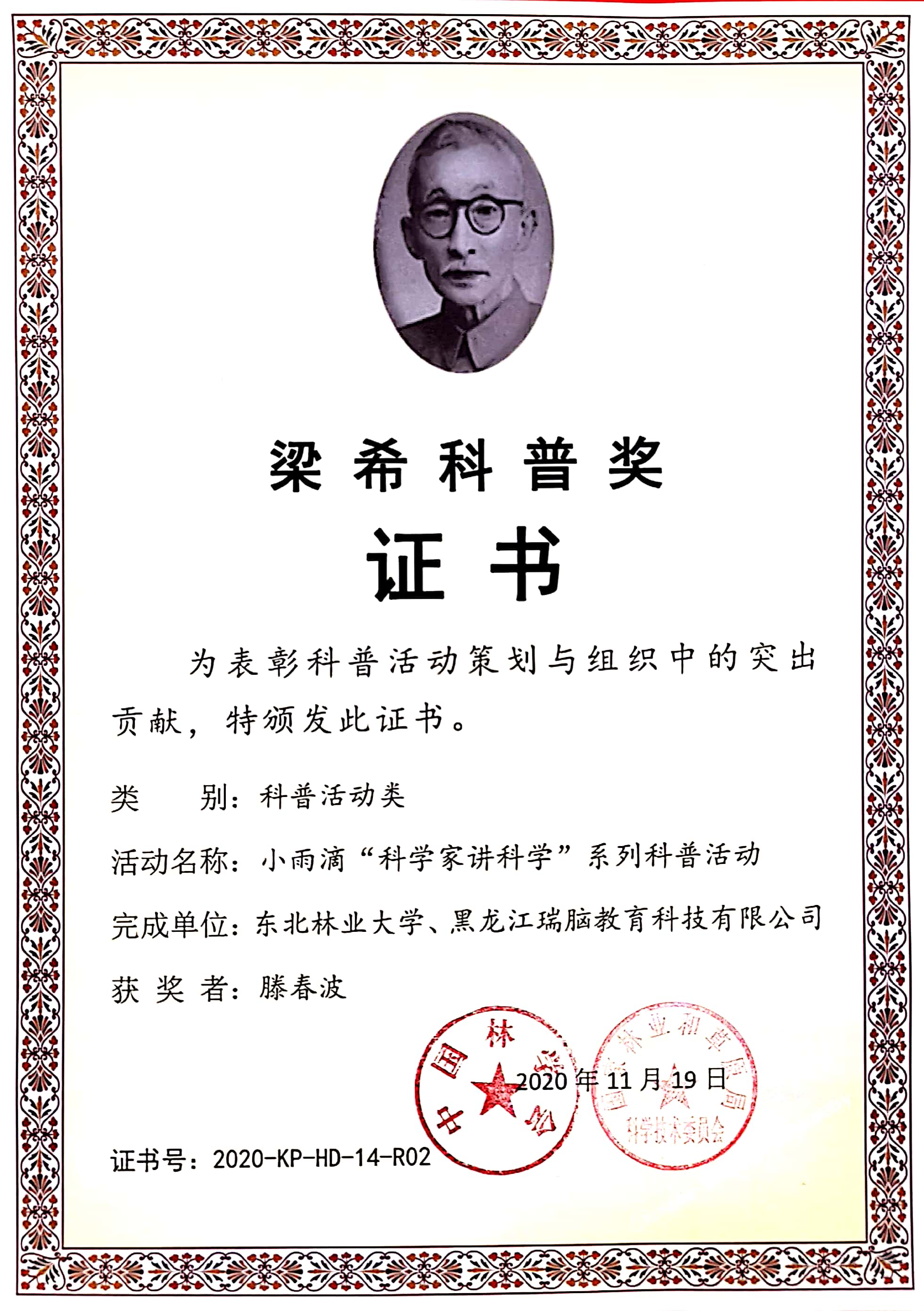 日前,从国家林草局获知,我校小雨滴“科学家讲科学”系列科普活动荣获第九届梁希科普奖,这是继2017年学校获奖后时隔3年再次获此殊荣。