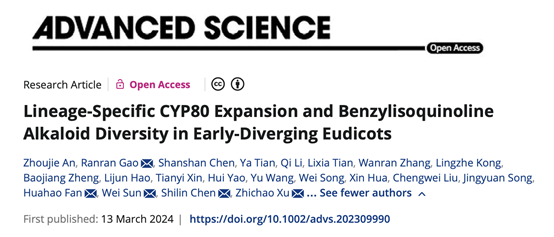 近日,我院徐志超教授团队在国际知名期刊《Advanced Science》(中科院一区,IF:15.1)在线发表了题为“基部双子叶植物苄基异喹啉类生物碱结构多样性形成机制(Lineage-specific CYP80 Expansion and Benzylisoquinoline Alkaloid Diversity in Early-diverging Eudicots)”的研究论文。基于本草基因组学研究策略,报道了催化青藤碱等苄基异喹啉生物碱(Benzylisoquinoline Alkaloid, BIAs)生物合成骨架形成的新颖酶,发现种系特异的CYP80基因扩张及新功能化驱动了防己科物种苄基异喹啉生物碱(Benzylisoquinoline Alkaloid, BIAs)结构多样性,为BIAs药用活性物质的绿色合成及药物开发提供支撑。