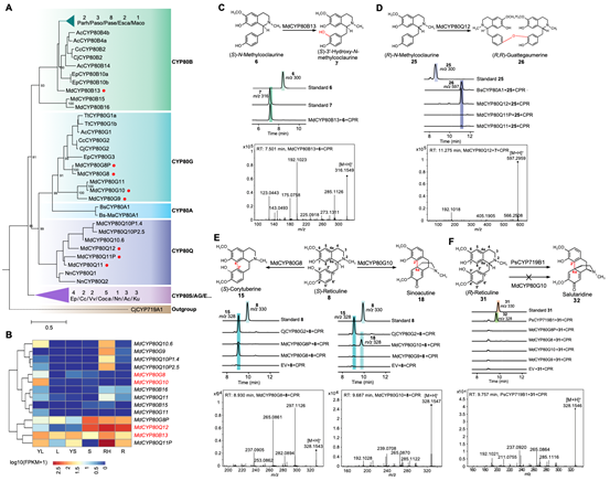 BIAs结构类型多样,药用价值高,如镇痛药物吗啡因、抗菌药物小檗碱等,也是重要的林源活性物质,广泛分布在双子叶植物的早期分化类群及木兰类中。近年来,我院客座教授陈士林院士团队相继完成毛茛科黄连(Liu et al., Nature Communications, 2021)、罂粟科毛黄堇(Xu et al., Plant Journal, 2022)、防己科千金藤属(Leng et al., Nature Communications, 2024)等物种中BIAs的代谢合成、起源进化及抗病毒活性等研究。然而,多数BIAs结构多样性形成及修饰的关键酶仍然未知,如防己科物种积累的双苄基异喹啉(千金藤素,抗病毒)、吗啡烷类(青藤碱,抗风湿)等,其结构多样性形成及进化的分子机制尚不明确。研究团队以防己科中药北豆根(Menispermum dauricum)为研究对象,破译其高质量基因组,追溯其物种进化、全基因组复制事件及染色体进化历程,提出“北豆根基因组可作为研究双子叶植物进化的理想模型”;研究人员进一步通过代谢组追踪了北豆根不同部位BIAs的结构类型差异;通过比较基因组发现防己科物种CYP80基因的显著扩张,该基因家族扩张及组织特异性表达驱动了BIAs不同结构类型的多样性。重要的是,创新性发现了催化牛心果碱发生C2'-C4a酚耦合反应生成清风藤碱(多花罂粟碱的对映异构体)的新颖酶MdCYP80G10,该酶具有严格的立体选择性,特异性识别(S)型牛心果碱。本研究为“基因组进化驱动植物代谢多样性形成”理论提供新的范例。